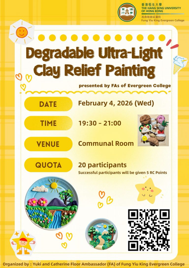 當指尖掂到柔軟可降解嘅超輕黏土,一場融合環保同美學嘅創作體驗就咁樣開始。我哋誠邀你參加今次浮雕畫活動,透過親手塑形同構築,唔單止可以鍛鍊手藝同空間想像力,更能直接感受環保物料嘅實用同趣味。等我哋一齊喺創作當中,重新認識可持續物料嘅藝術價值,將環保理念化為一件件生動嘅作品,喺實踐入面收穫滿足感,亦為日常生活注入多啲綠色創意。
